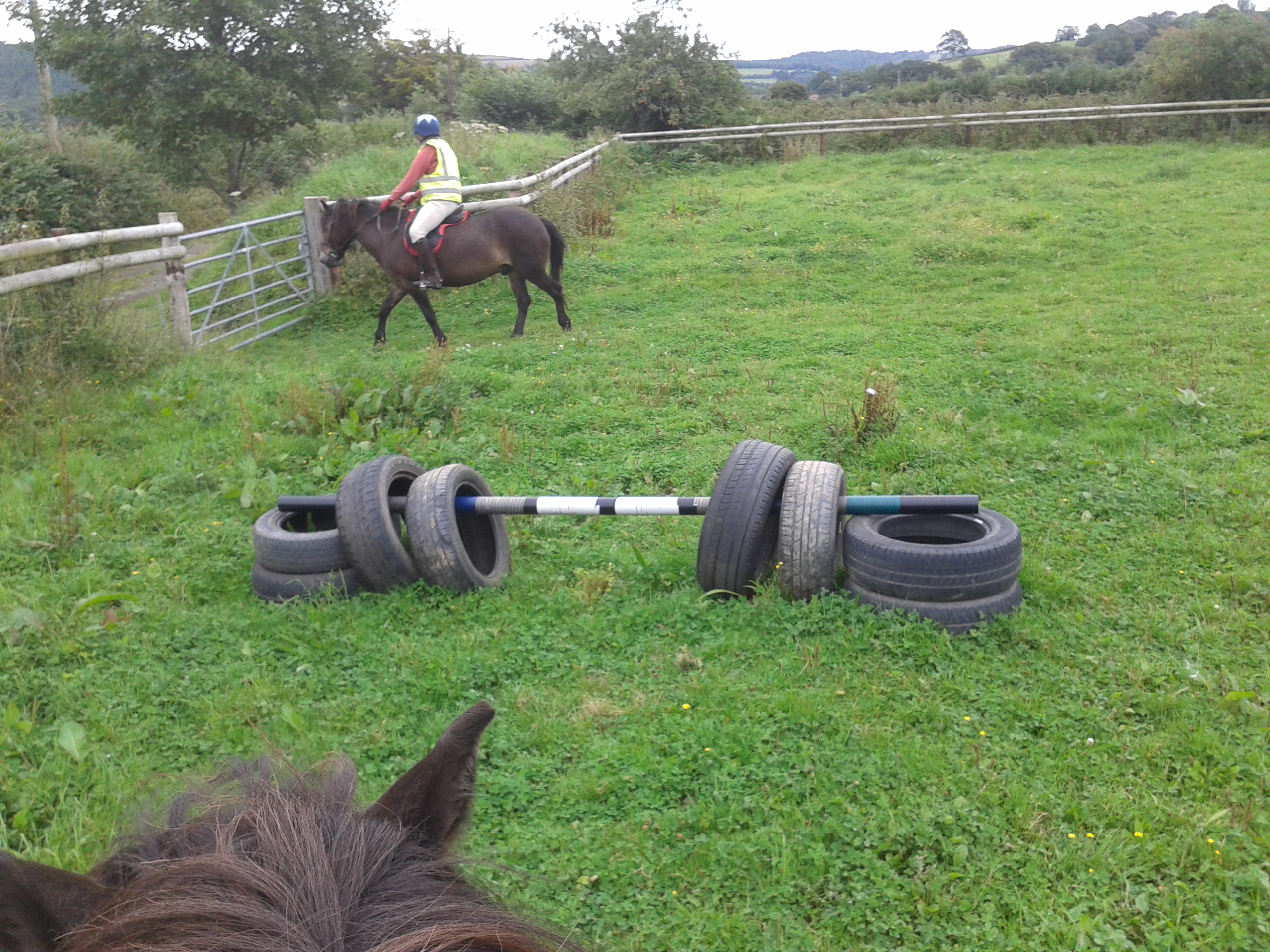 We are just jumping the pole in the middle at the moment. It took him by surprise the first time he saw it and he slid to a stop but after that he popped over it happily. I will fill in the gap soon so we are actually jumping the tyres themselves.