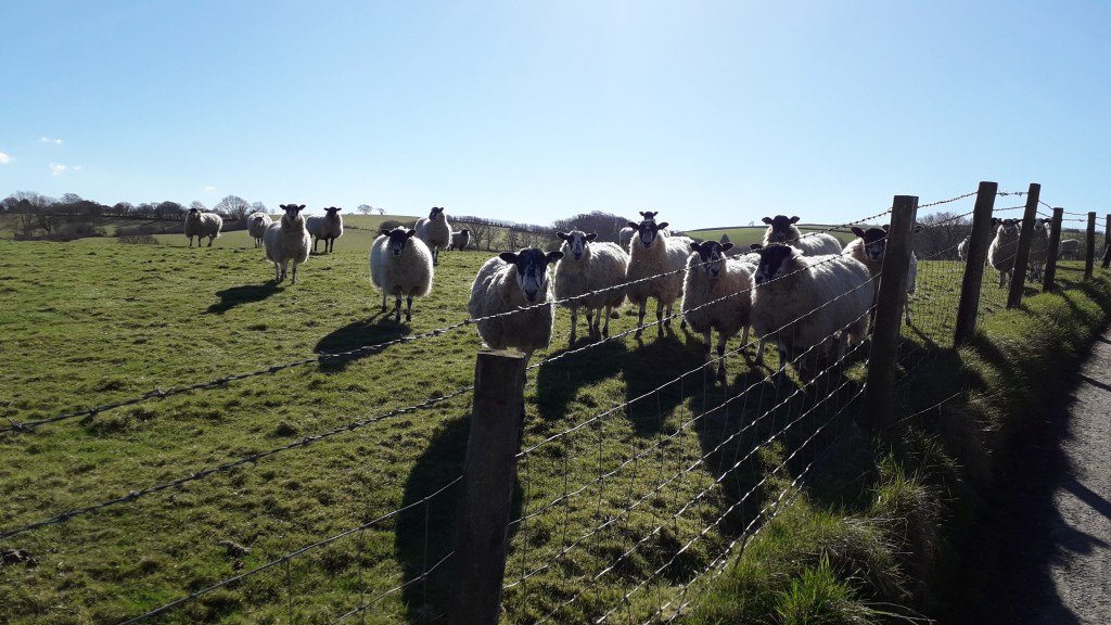 Galahad knew what was happening long before I did, standing stock still and staring up the hill. I assumed he was just aware of the pheasants in the hedgerow but no – all the sheep in the field came running over to see what we were up to. That was one thing but when they started following us along the fence line it became somewhat unnerving.