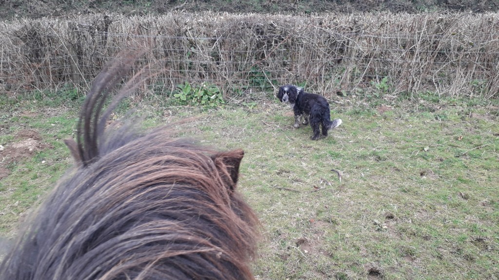 For lazy days like today it is the prerfect activity. There is nothing strenuous required as there would be in a schooling session and no need to keep an eye and ear open for oncoming traffic on the roads. Of course, we can’t go any great distance in a straight line but we can certainly do a decent amount of pottering – and now the ground is drying out we can even get in some reasonable canters.
